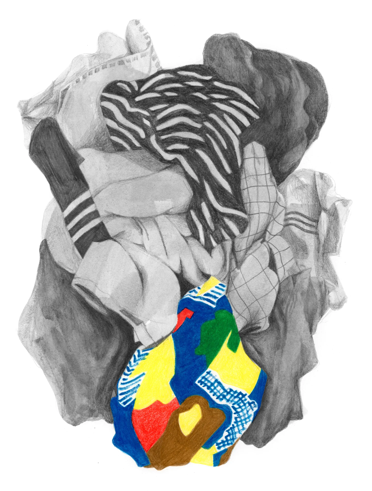 These drawings are rooted in personal experiences of revelation and memories: a work uniform on a bed that revealed my mom’s new boyfriend before she did, or an office chair that holds the absence of camaraderie I once had in a 9-to-5 job. There’s loss in these pieces, but I also want to bring in humor. This is about what fabric represents when the humans are missing.