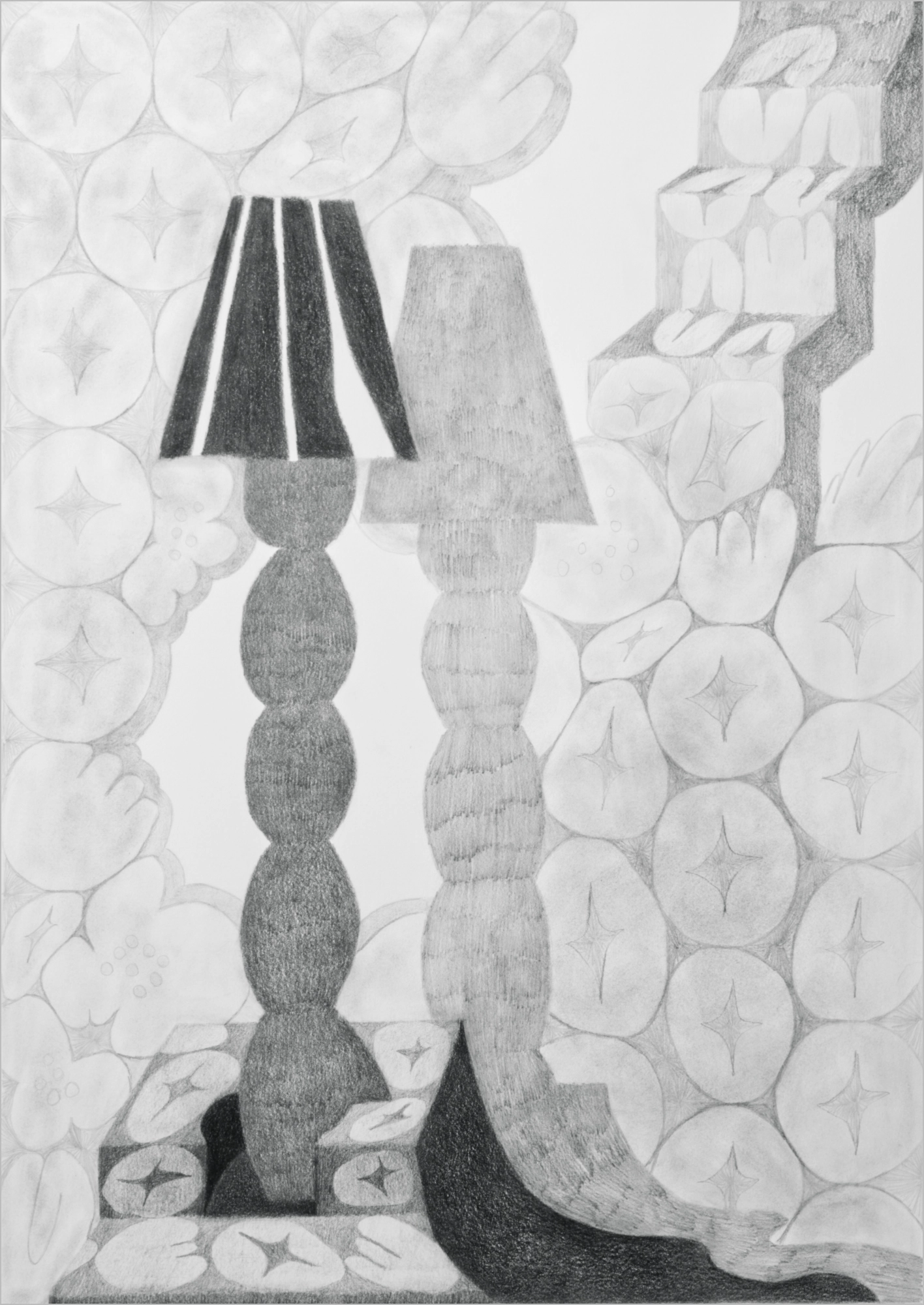 Unreal Estate is a series of drawings about spaces that won’t behave. Inside and outside collapse into each other, and the viewer can’t fully “enter” the scene. Pattern becomes environment, objects act like structures, and familiar architecture slips into something softer and unreliable. The drawings follow logic just long enough to break it.